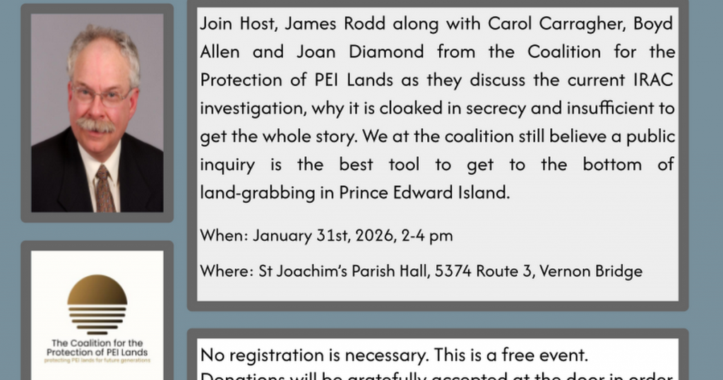 There are many options being discussed about how to best get the truth about land-grabbing in PEI. We plan to clarify our position and will be open to questions on this critical issue. Please join us and help us keep this critical issue in the minds of all Islanders.